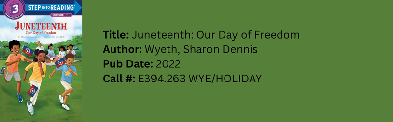 Today marks a very special occasion! On June 19th, 1865 is when the very last group of slaves found out they were free, thereby making this a holiday to celebrate! There is so much history to learn about Juneteenth and we have a wide selection of books for you to choose from. Come visit the library and check out whatever fits your reading needs! Below is a list of the books we selected just for our wonderful patrons: